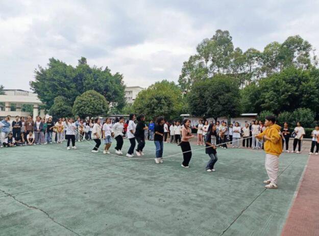 競賽進行時團體跳繩「裁判員準備,選手準備,預備,跳!」口令之後,一分鐘班級集體跳繩競賽正式開端。只見班級各隊員腳下生風,輕如燕飛,他們容光煥發,全力投入,爭分奪秒,只為班級榮譽奉獻自己的一份力氣。